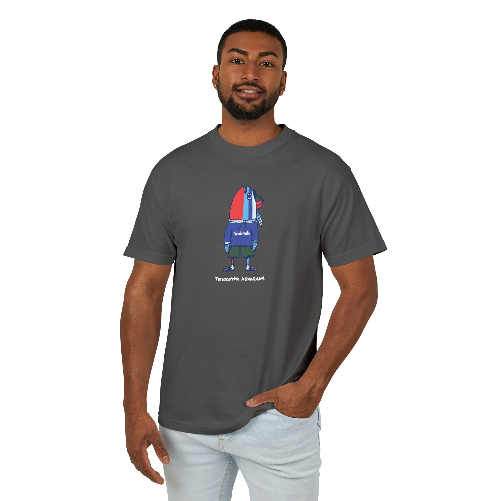 The original Cardinals Guy Tee Shirt. Designed by Lucas and polished up by his lovely wife Bridget. This shirt is made to order so may take just a little bit longer to ship. The garment is made from 100% high end cotton and offers a vintage faded black look. It features a wide rib collar and taped neck and shoulders. Our Tee Shirts are produced in a socially conscious facility that partners with the Fair Labor Association and is WRAP certified, which ensures fair labor practices.