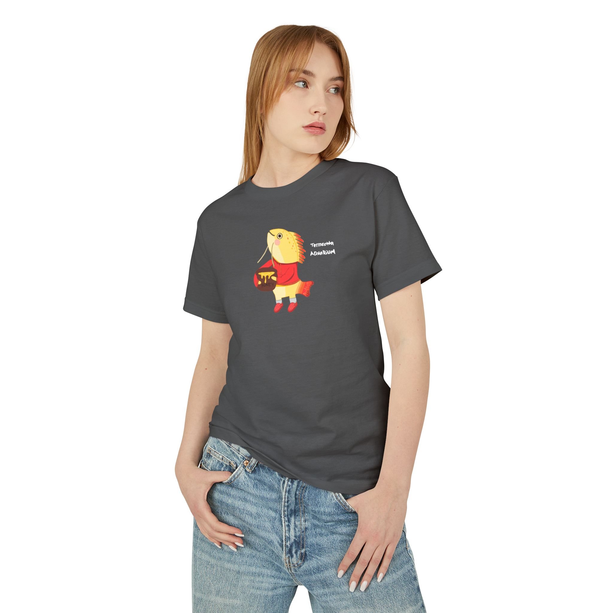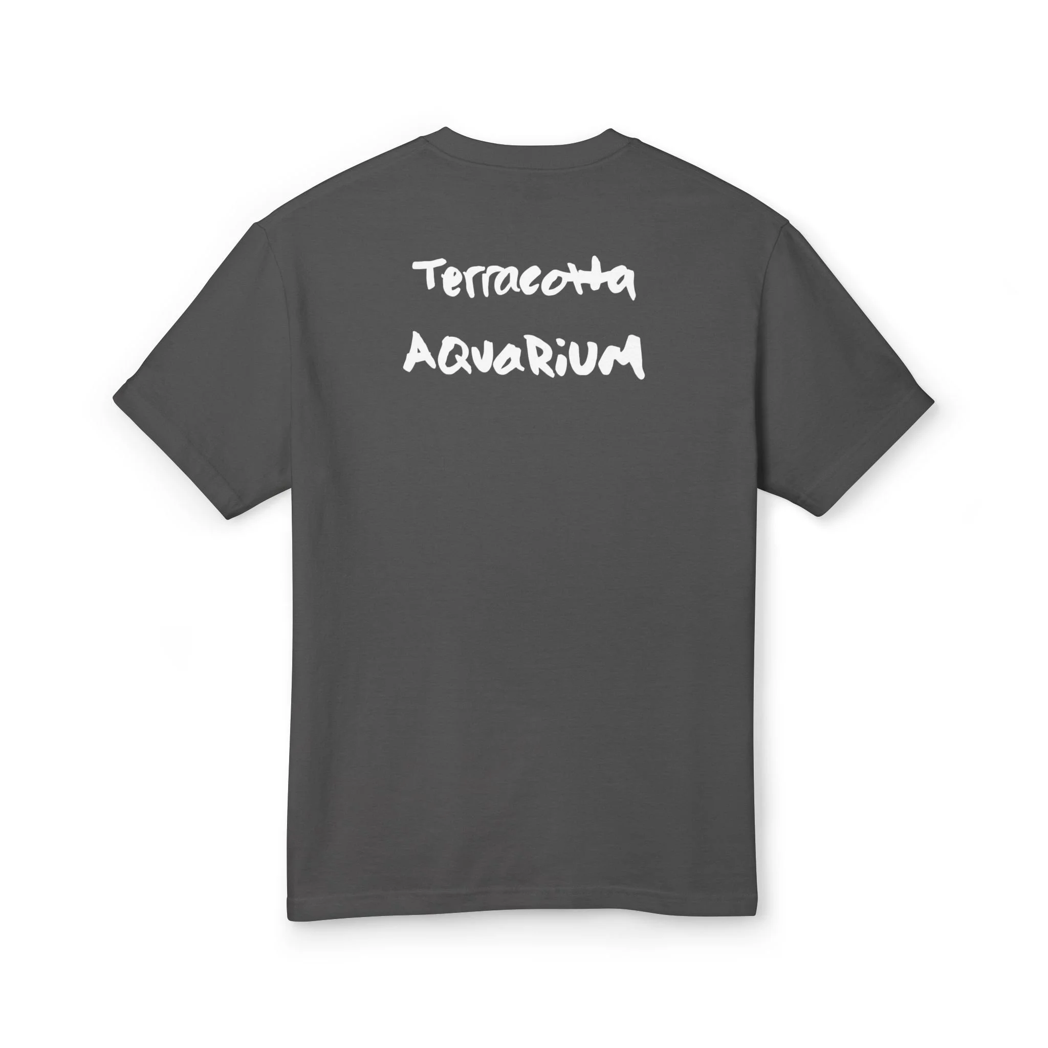 The original Honey Gourami Guy Tee Shirt. Designed by Lucas and polished up by his lovely wife Bridget. This shirt is made to order so may take just a little bit longer to ship. The garment is made from 100% high end cotton and offers a vintage faded black look. It features a wide rib collar and taped neck and shoulders. Our Tee Shirts are produced in a socially conscious facility that partners with the Fair Labor Association and is WRAP certified, which ensures fair labor practices.
